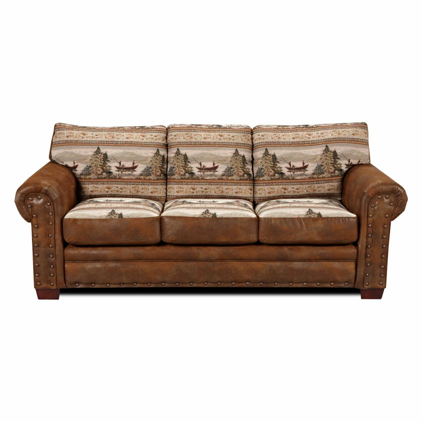 The Outdoor Leisure Products Alpine Lodge Sofa uses its cotton tapestry with nature scene, faux leather, and nailhead accents to create its rugged look. This sofa stands on a solid wood frame with fiber-wrapped foam cushions.