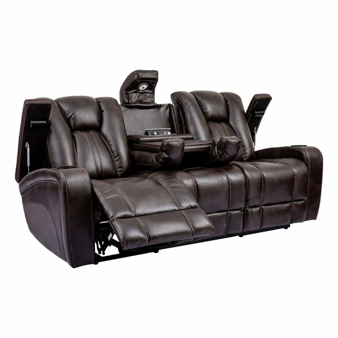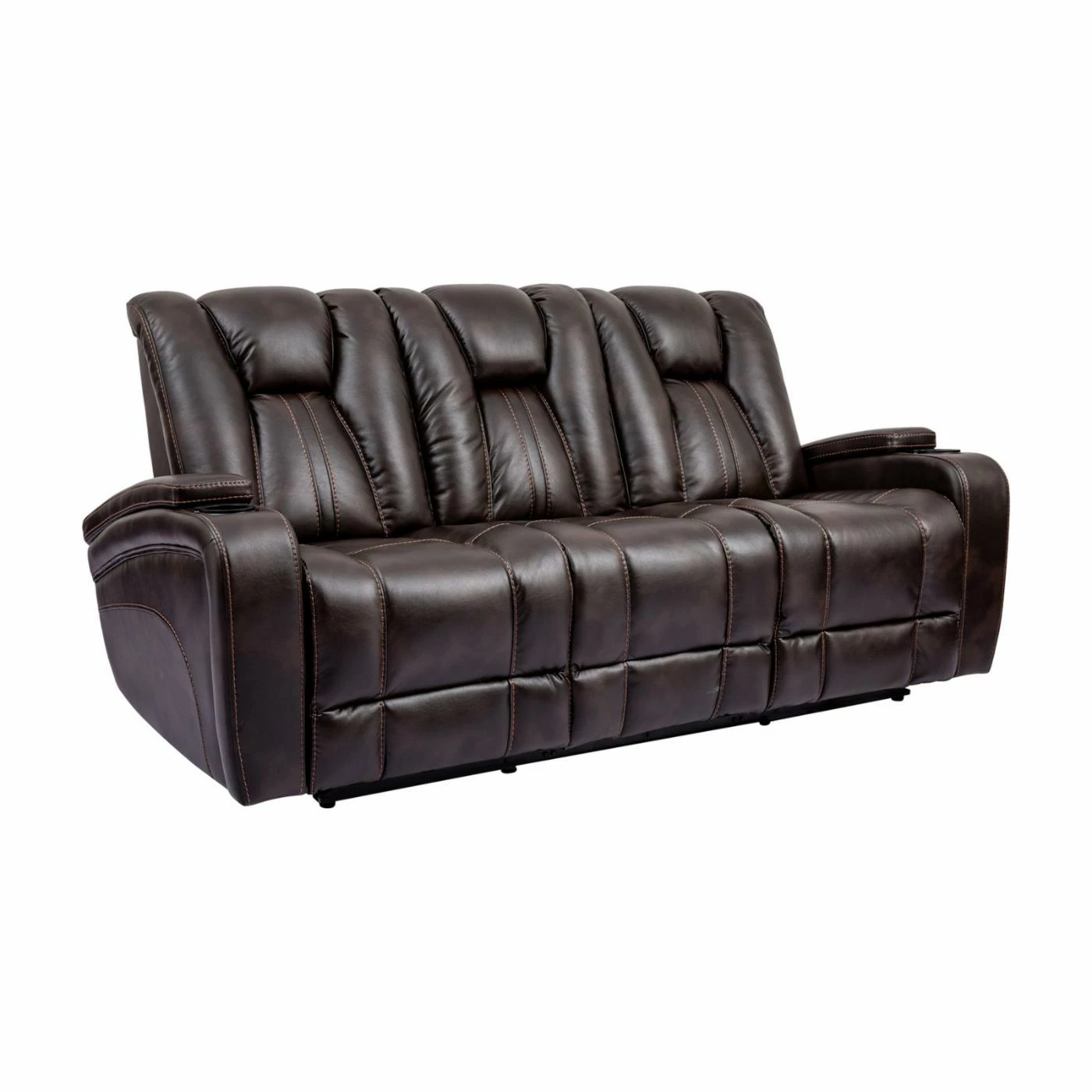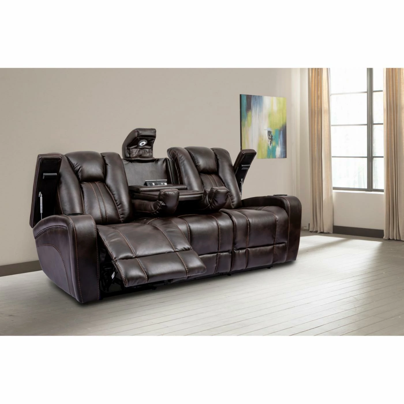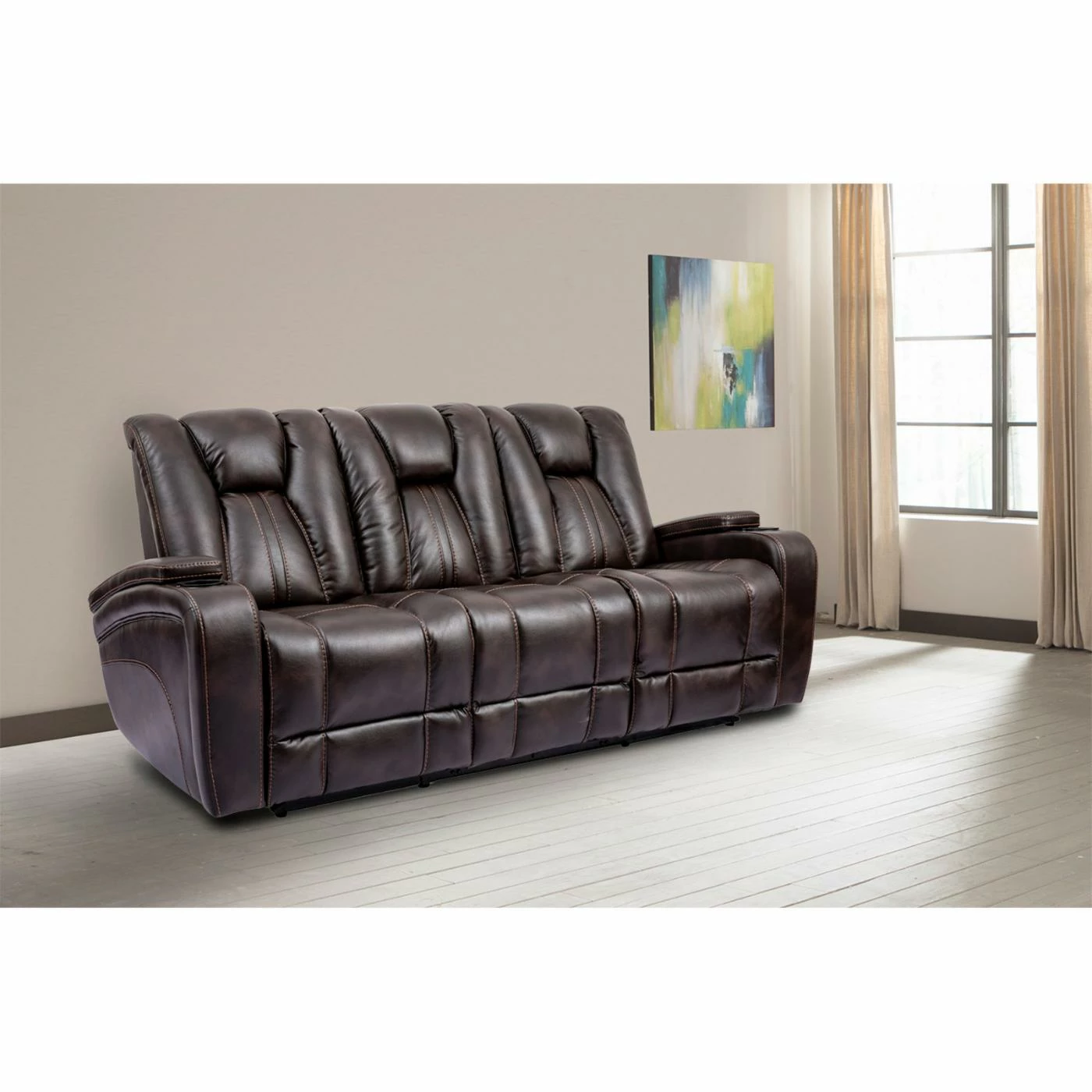 Unwind after a busy day with the Parker House Optimus Truffle Power Reclining Sofa. This sofa has a motorized power recline mechanism that you can operate with the touch of a button. Power headrests also adjust to support your head and neck. The luxury foam cushions are upholstered in a rich, dark brown polyester blend. Stitched details add visual interest to the piece. You can comfortably seat three people on this sofa, and the two end seats recline. Flip the center seat up to reveal the console with two cup holders, an electrical outlet and USB charging station, and an overhead light. Padded arms offer comfort and support as you relax and watch your favorite show or read a book. Both arms also lift up to reveal cup holders. With its contemporary design, this sofa is sure to add style and comfort to any room it’s in.