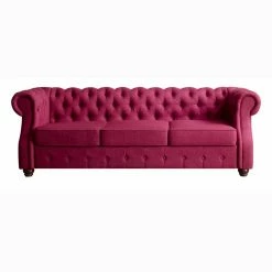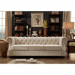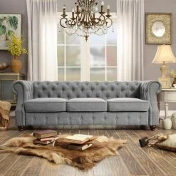 Deliver a polished look to your dΓ©cor with the Rosevera Evart Tufted Chesterfield Sofa. This sofa features gorgeous linen upholstery with button-tufted accents. Choose from the available color options to complement your existing dΓ©cor. Its rolled arms and bun feet enhance its traditional appeal, while the rubberwood frame provides the sound base you need in any sofa. Adorned with generously filled cushions, this sofa brims with cozy comfort.