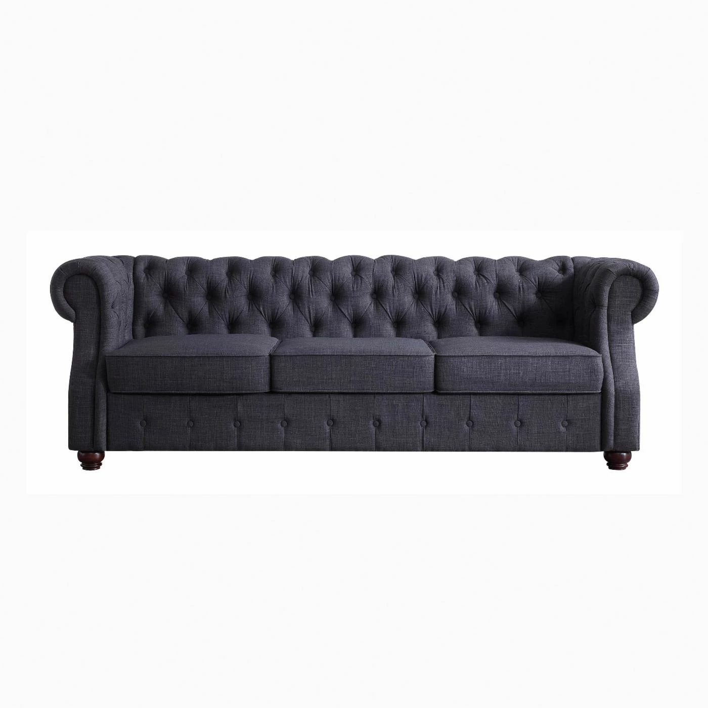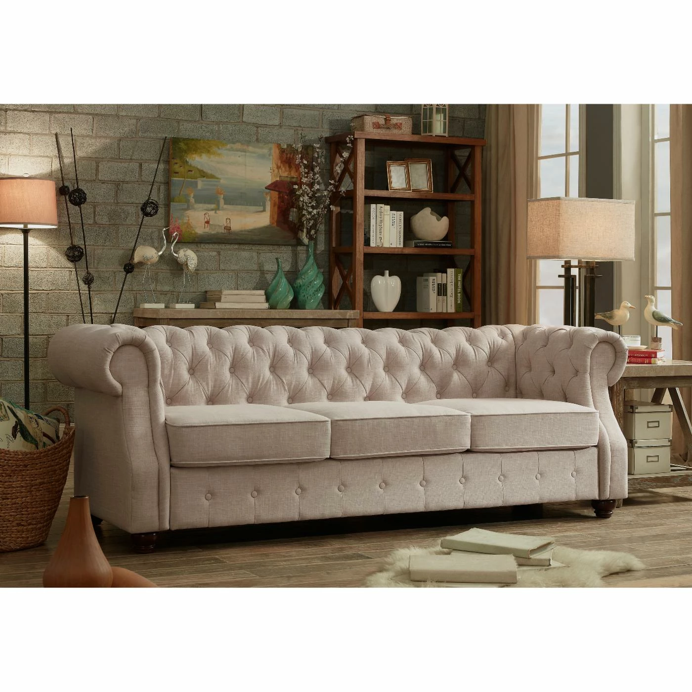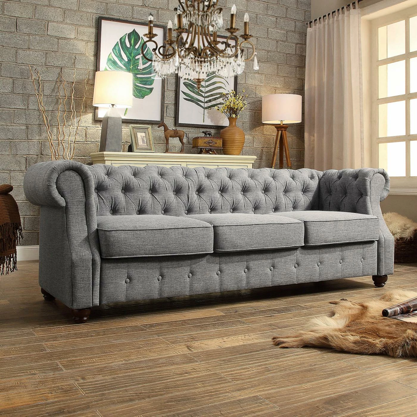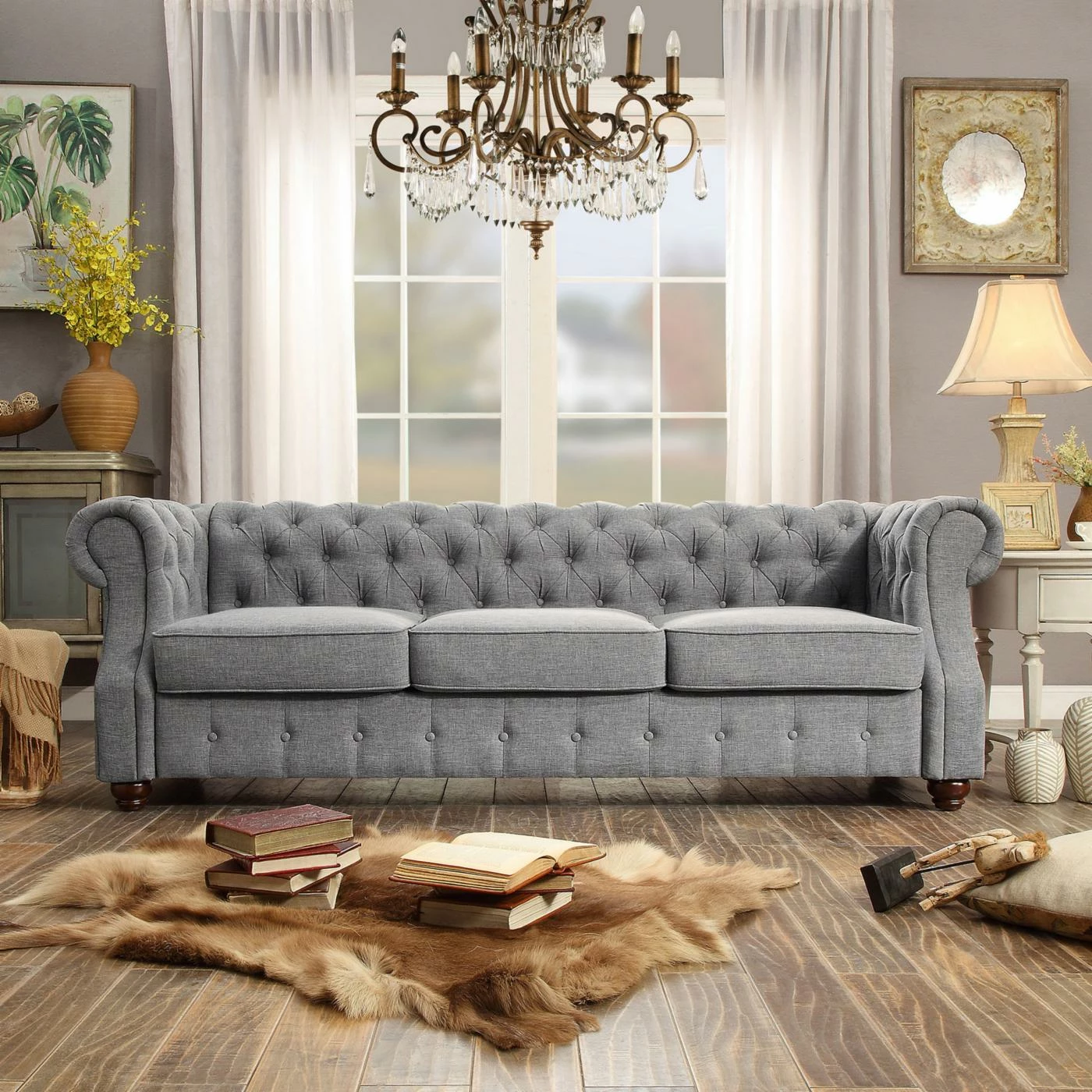 Deliver a polished look to your dΓ©cor with the Rosevera Evart Tufted Chesterfield Sofa. This sofa features gorgeous linen upholstery with button-tufted accents. Choose from the available color options to complement your existing dΓ©cor. Its rolled arms and bun feet enhance its traditional appeal, while the rubberwood frame provides the sound base you need in any sofa. Adorned with generously filled cushions, this sofa brims with cozy comfort.