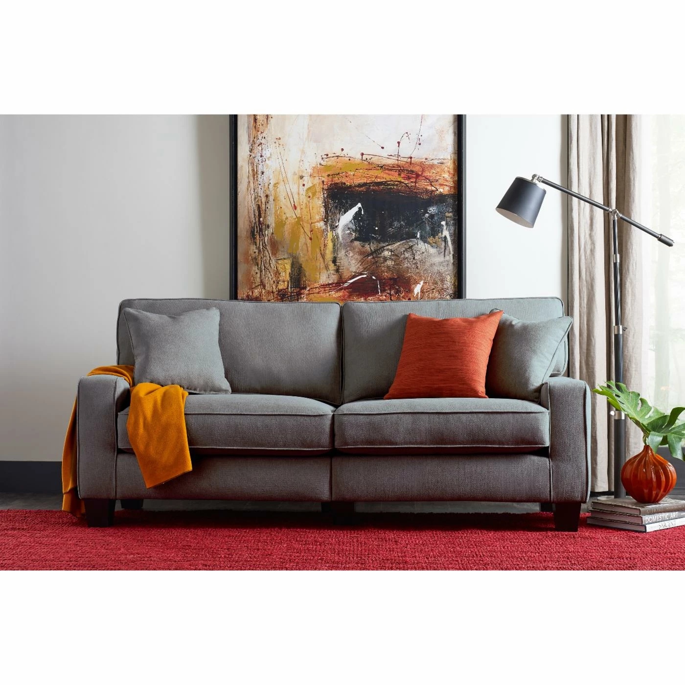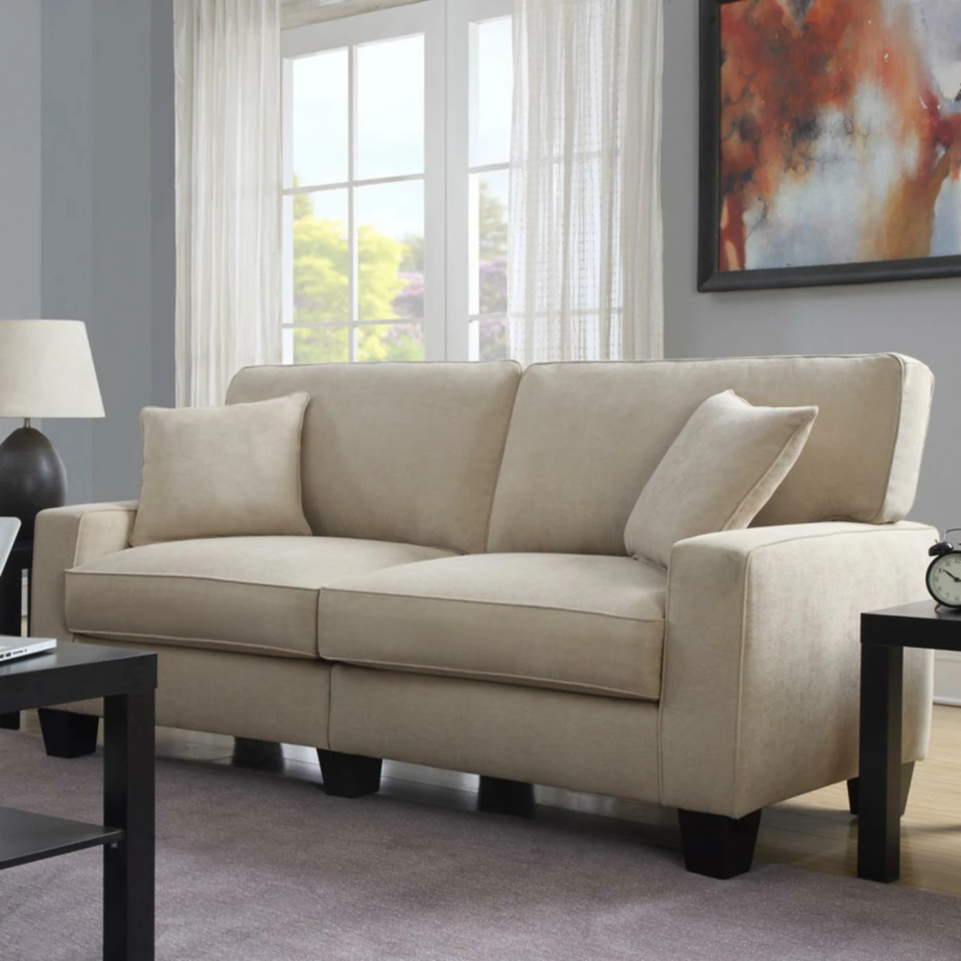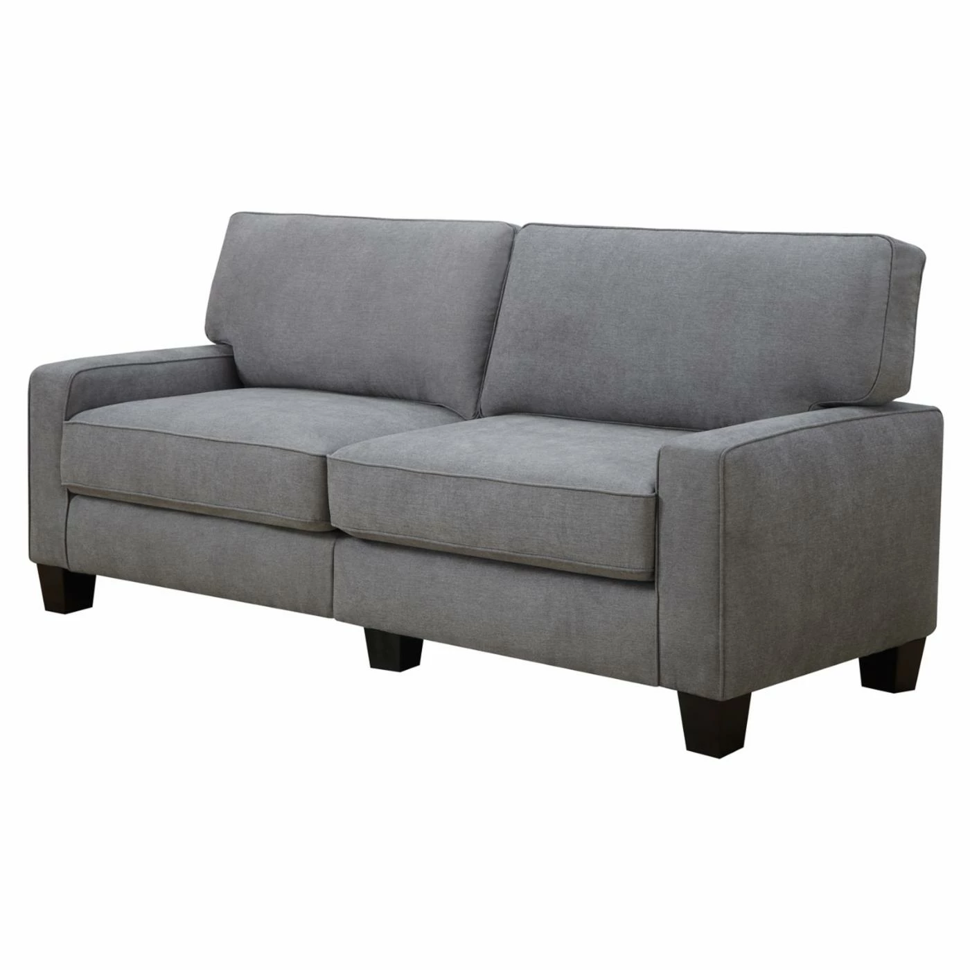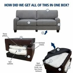 With simple style and posh appeal, the Serta RTA Palisades Collection 73 in. Sofa is ideal for any space but works wonders, in small spaces or for those who want high quality and easy assembly. This handy design features one-box packaging and tool-free assembly. This sofa’s versatile, transitional design is the result of high-quality materials and top-notch construction. Featuring a hardwood frame, further supported with hardboard inner lining, this piece is packed with comfort! Ultra-wide back straps, s-coils, individually wrapped pocketed coils, and high-density polyurethane foam are all covered in a lush, premium upholstery in your choice of available color options. Poly-fiber-filled pillowed back cushions complete the package. Espresso-finished feet are the icing on the cake. Perfect for those who want their comfort – but want it easy and stylish, too.