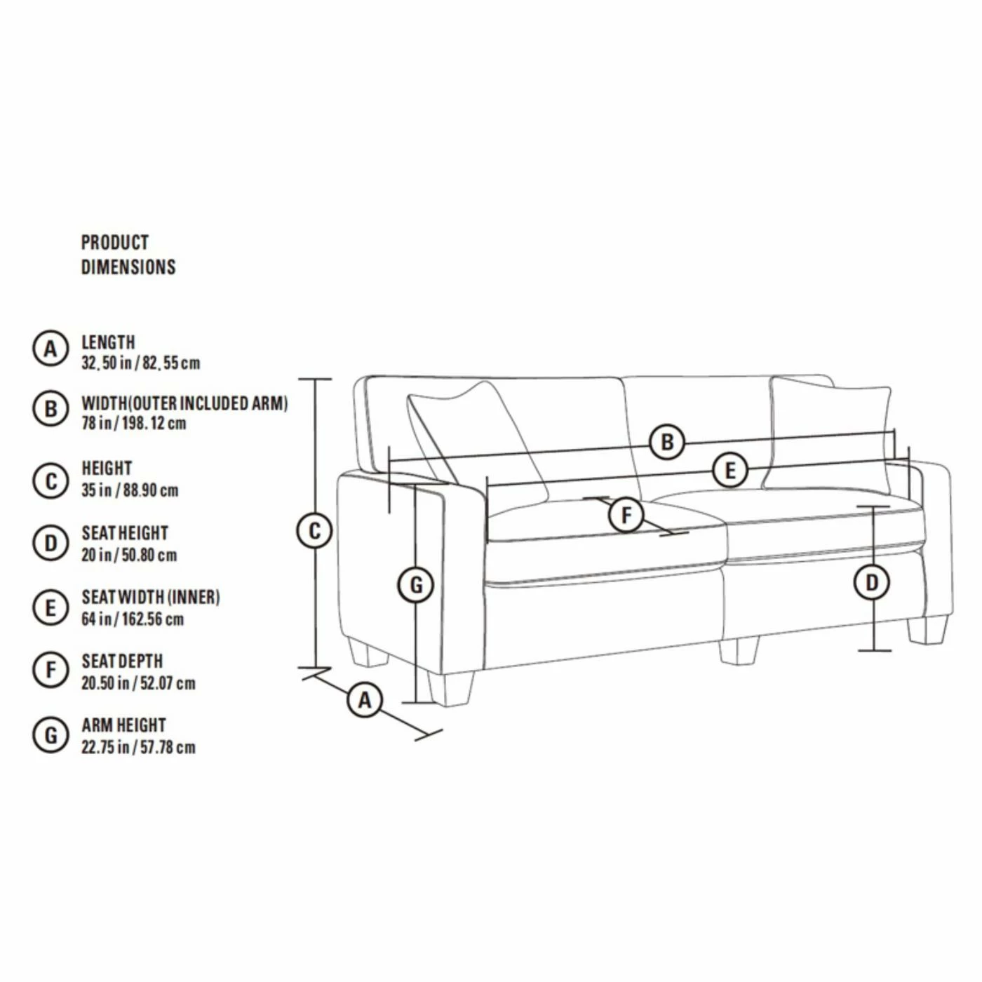 The perfect piece for just about any space requiring more seating, the Serta RTA Palisades Collection 78 in. Sofa is ideal – especially for those who want high quality and easy assembly. This handy design features one-box packaging and tool-free assembly. This sofa’s versatile, transitional design is the result of high-quality materials and top-notch construction. Featuring a hardwood frame, further supported with hardboard inner lining, this piece is packed with comfort! Ultra-wide back straps, s-coils, individually wrapped pocketed coils, and high-density polyurethane foam are all covered in a lush, premium upholstery in your choice of available color options. Poly-fiber-filled pillowed back cushions and espresso-finished feet are the icing on the cake. Perfect for those who want their comfort – but want it easy and stylish, too.