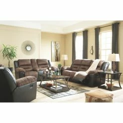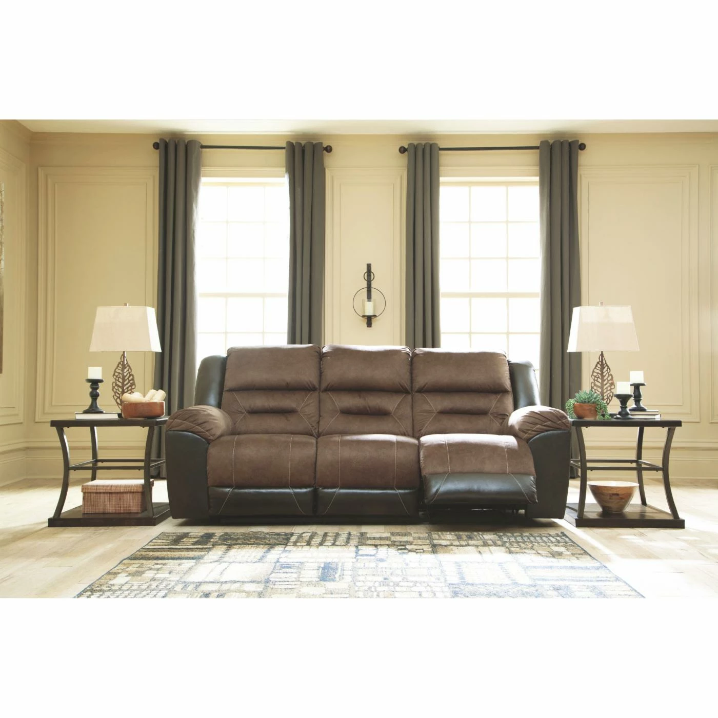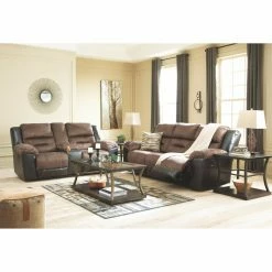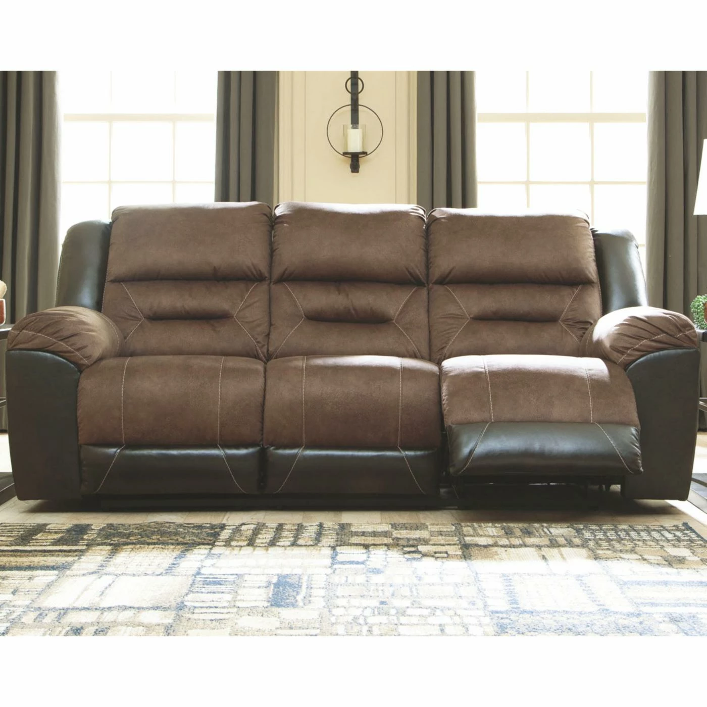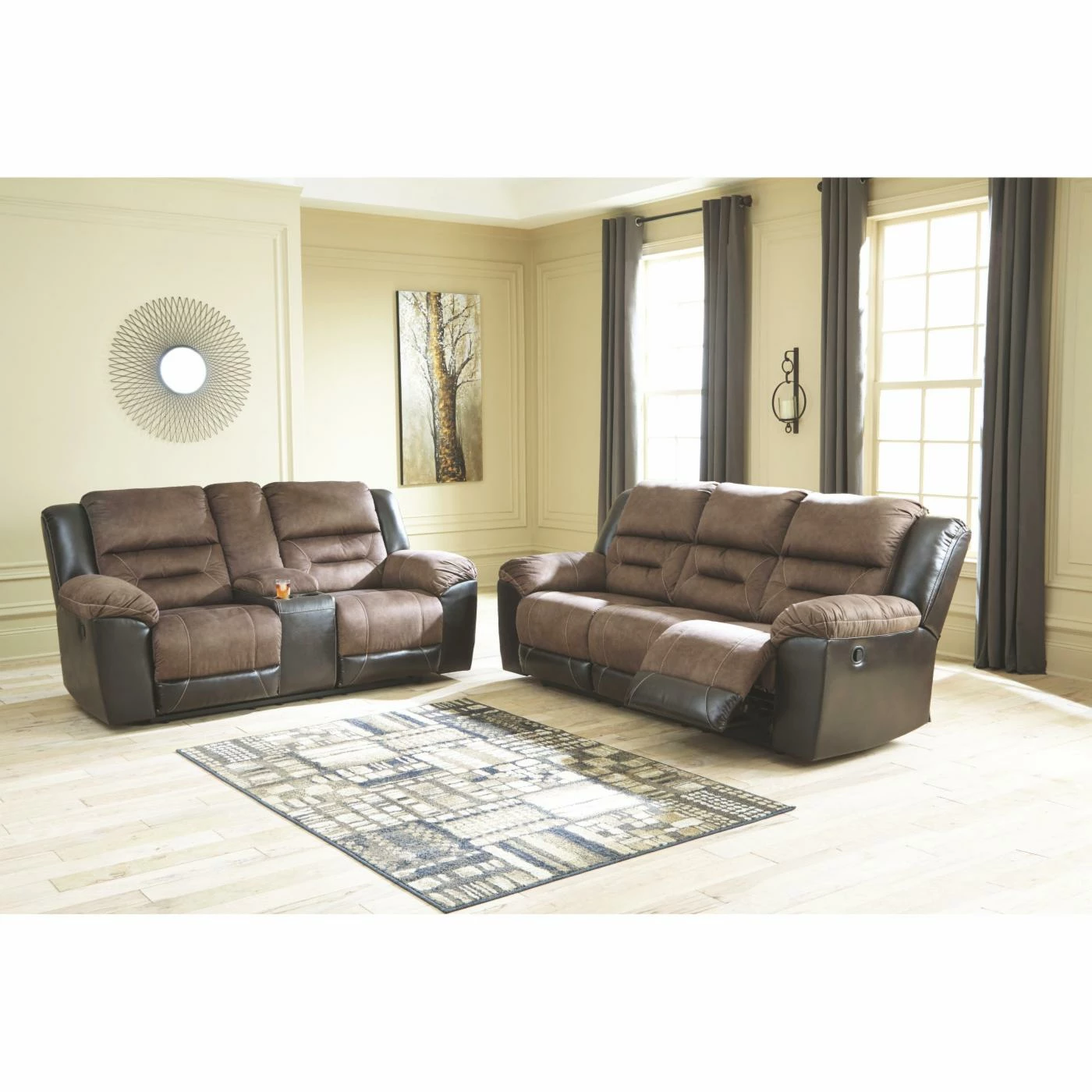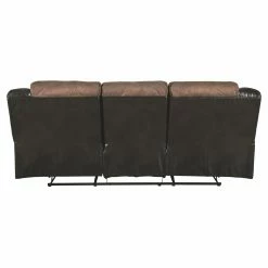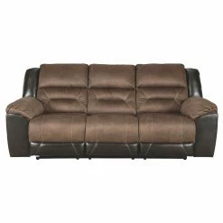 The Signature Design by Ashley Earhart Double Reclining Sofa has a bold two-toned look that draws the eye and begs you to take a seat. This reclining sofa combines a soft suede-like feel on the seats and arms with the bold look of faux leather on the edges. The suede-like upholstery on the arms, cushions, and inside back is made from 95% polyester and 5% polyurethane. The upholstery on the rest of the sofa’s exterior is made from polyester, polyurethane, and PVC.