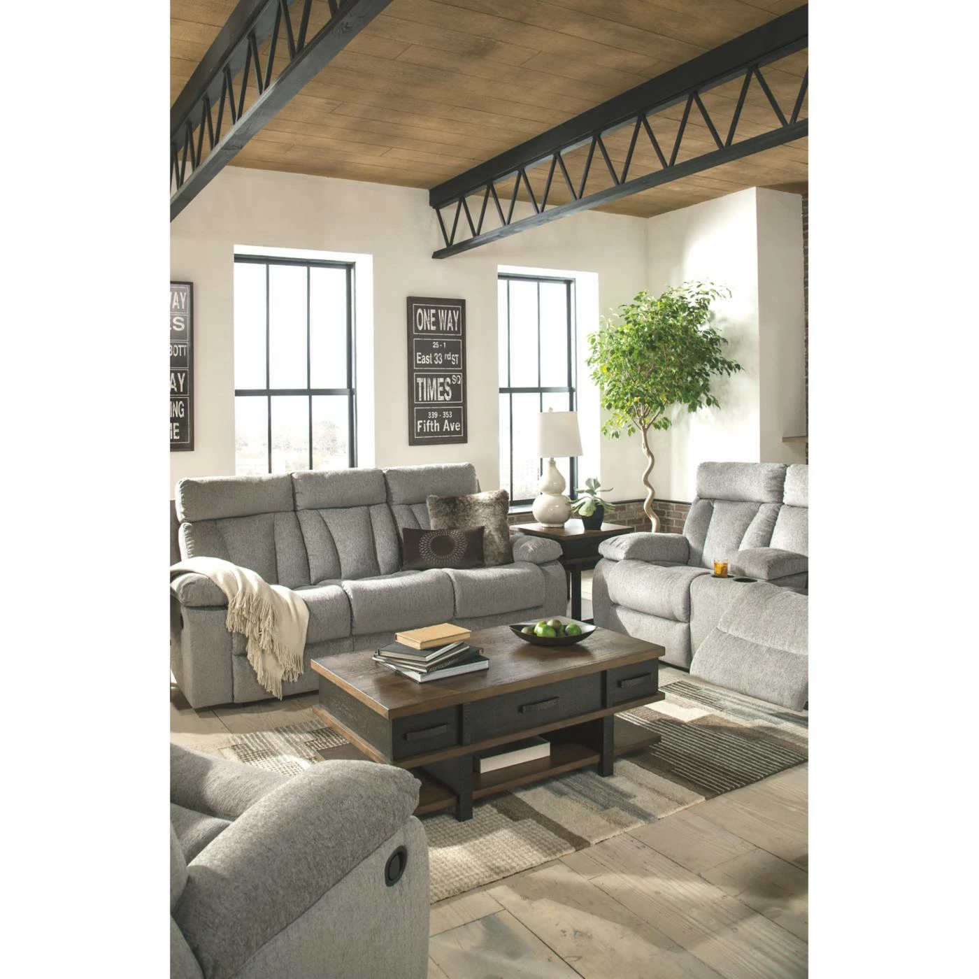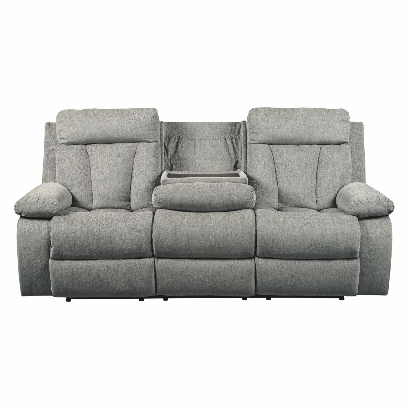 With its modernized features and heathered fog gray upholstery, the Signature Design by Ashley Mitchiner Reclining Sofa is a match to your well-loved living room or home theater. End seats in this sofa recline for comfort. The center seat flips down to expose a hard top table with two built-in cup holders and a shirred storage pocket.
