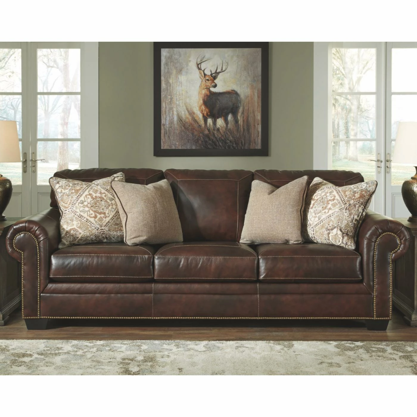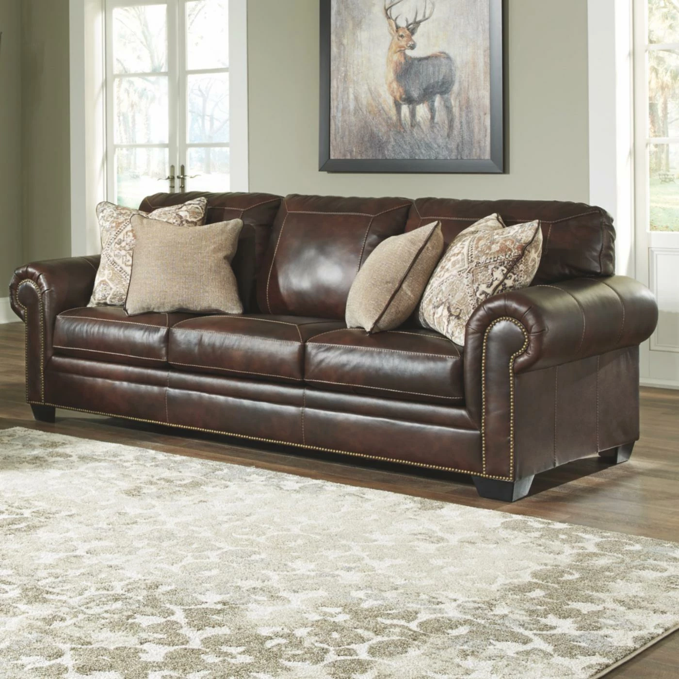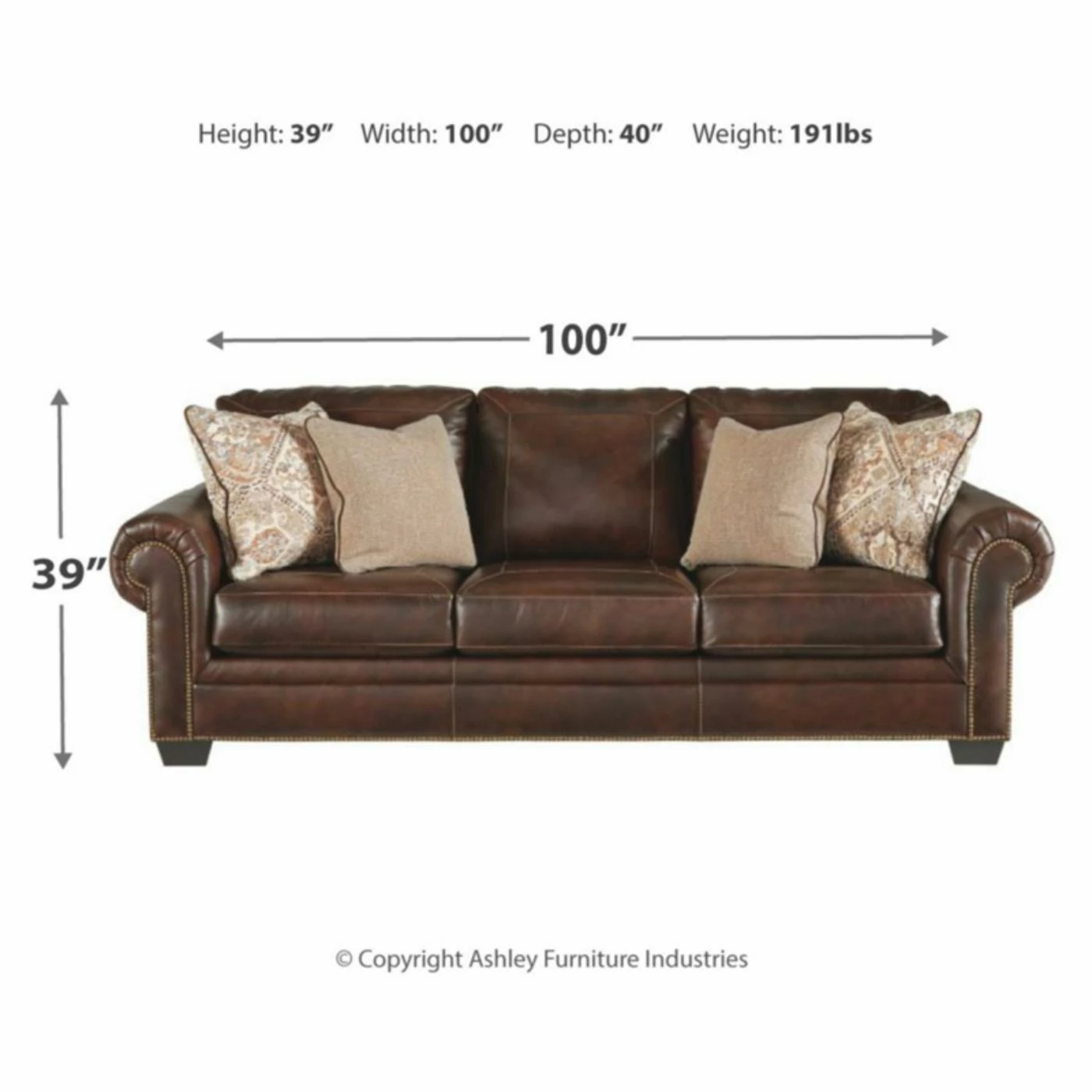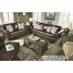 Center your traditional living area around the Signature Design by Ashley Roleson Sofa. This spacious sofa features rolled arm details accented with nailhead trim. Four plush pillows top the thick cushions for lasting comfort. This sofa boasts a walnut brown faux leather upholstery over high-resiliency foam cushions.