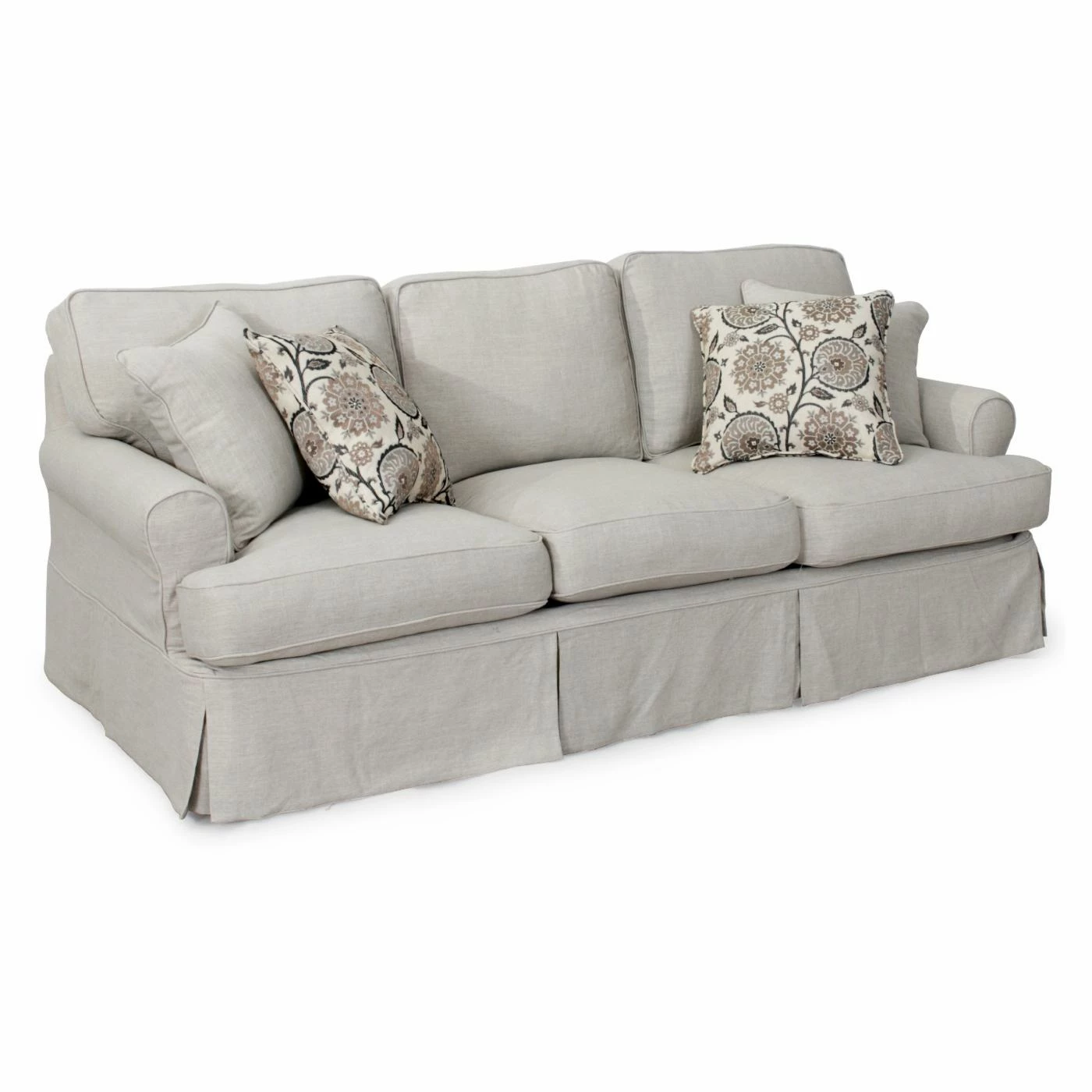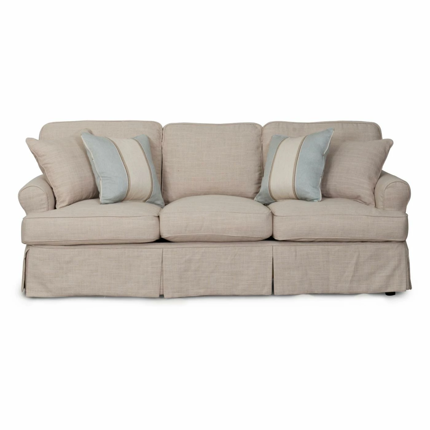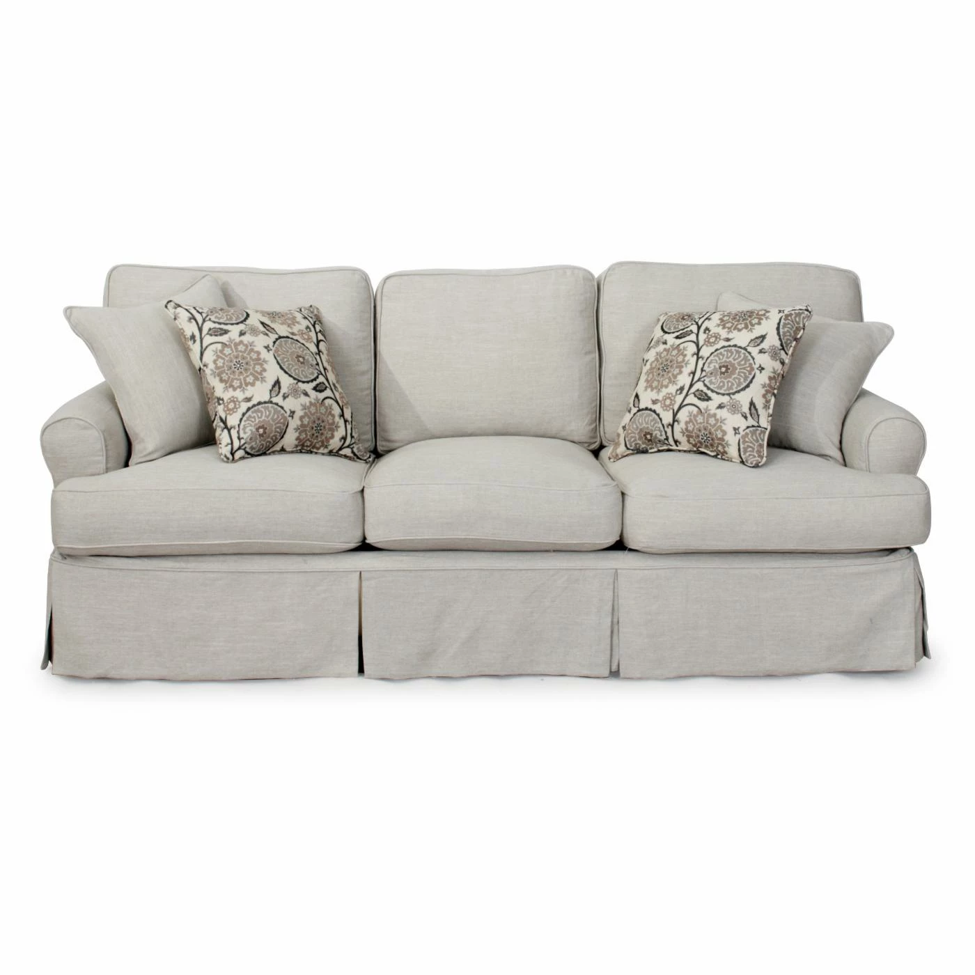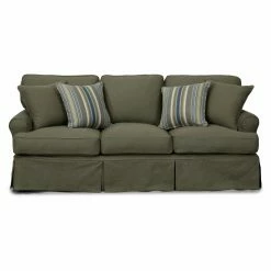 Casual grace lives in the Sunset Trading Horizon Slipcovered Sofa. This generous sofa features a laid back slipcover design with kick pleated skirt for an elegant look. Rolled arms and welted, T-shaped cushions create the classic profile. The polyester and acrylic blend upholstery is available in a variety of color and pattern options. For added style, this sofa includes two matching and two coordinating accent pillows.