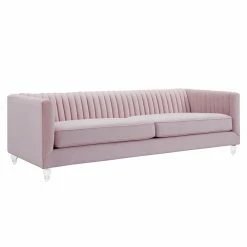Comfort is never waning with the TOV Furniture Aviator Sofa. Contrasting vertical tuxedo style back pleats with long, clean horizontal lines provide visual interest, while removable seating cushions filled with high-density foam provide heavenly comfort. The low back, deep seated design suggests elegance, while the kiln dried wood frame handmade by skilled craftsman provides durability. Decorative curved lucite legs are the perfect finishing touch, making the sofa seem as if it is floating on air.