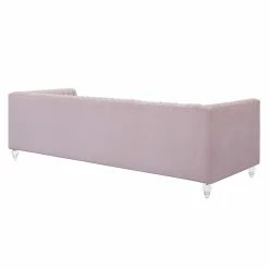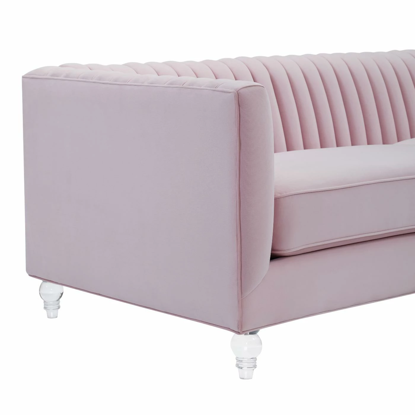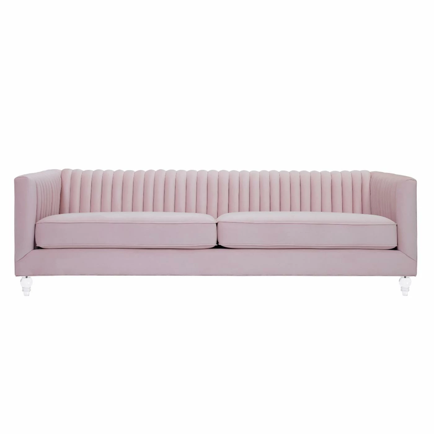 Comfort is never waning with the TOV Furniture Aviator Sofa. Contrasting vertical tuxedo style back pleats with long, clean horizontal lines provide visual interest, while removable seating cushions filled with high-density foam provide heavenly comfort. The low back, deep seated design suggests elegance, while the kiln dried wood frame handmade by skilled craftsman provides durability. Decorative curved lucite legs are the perfect finishing touch, making the sofa seem as if it is floating on air.
