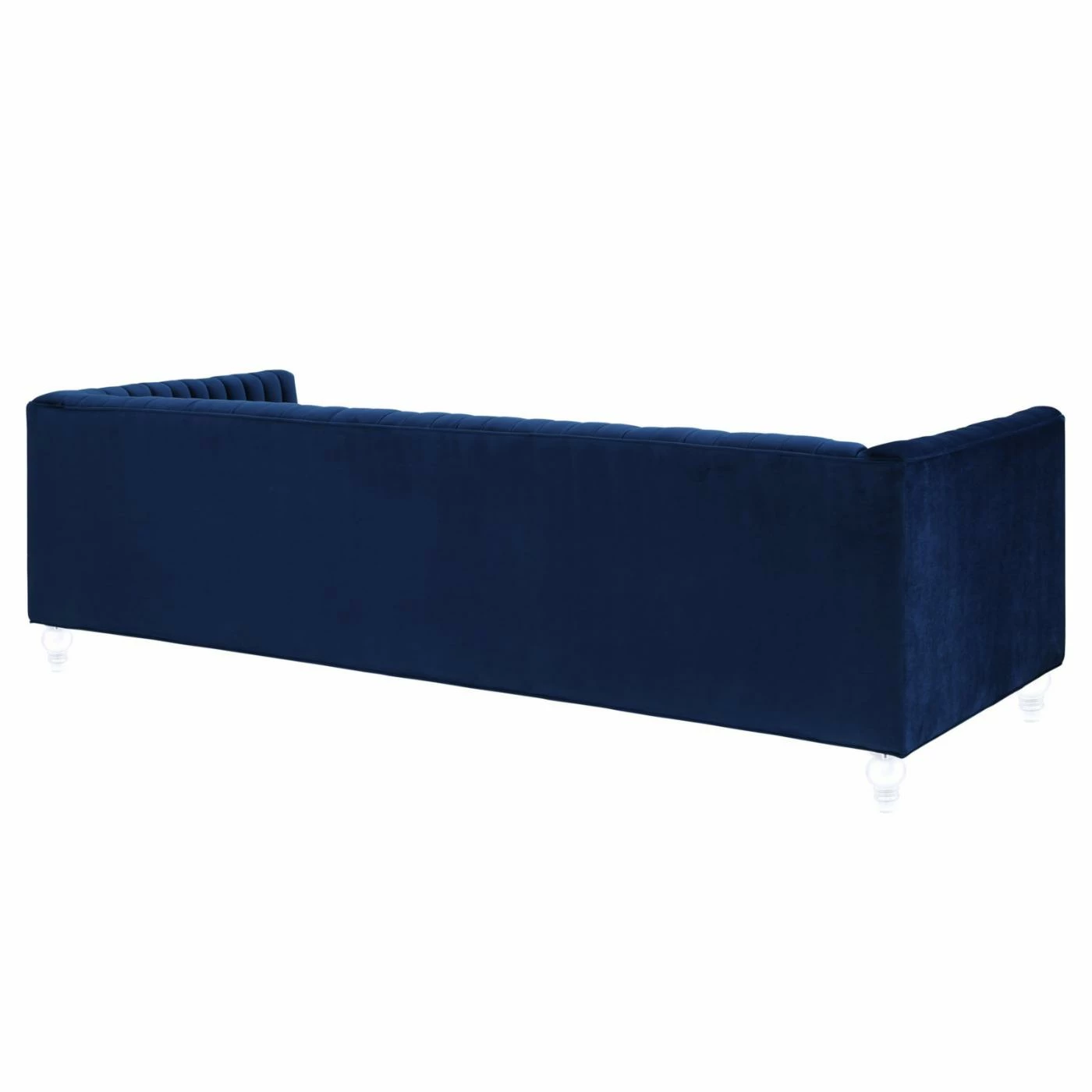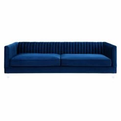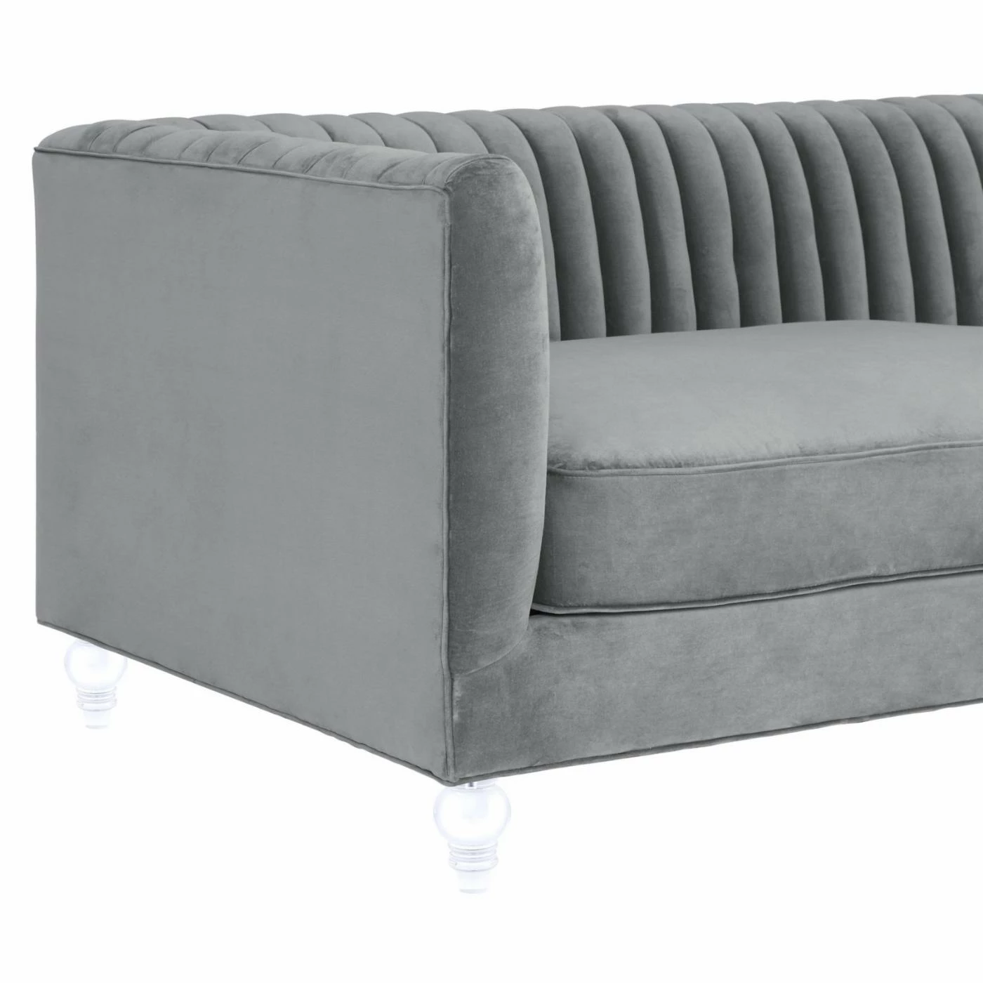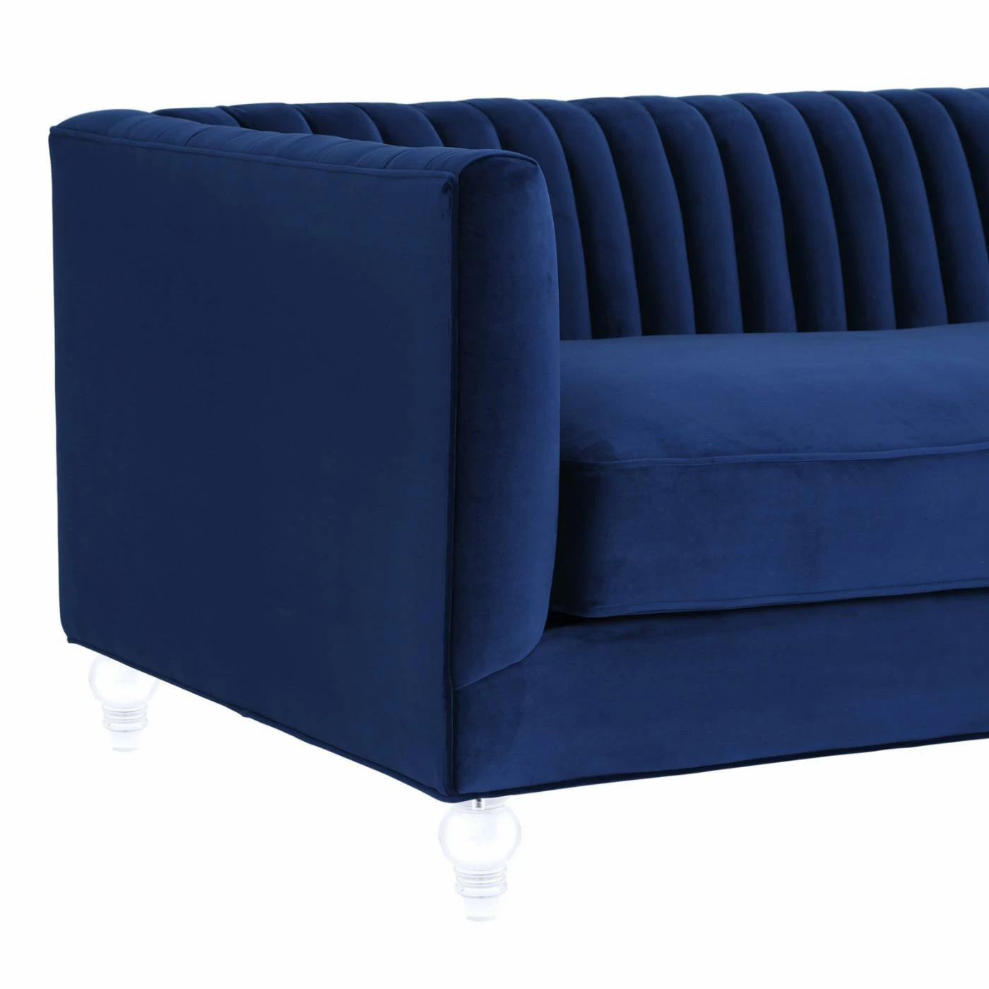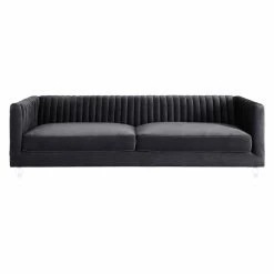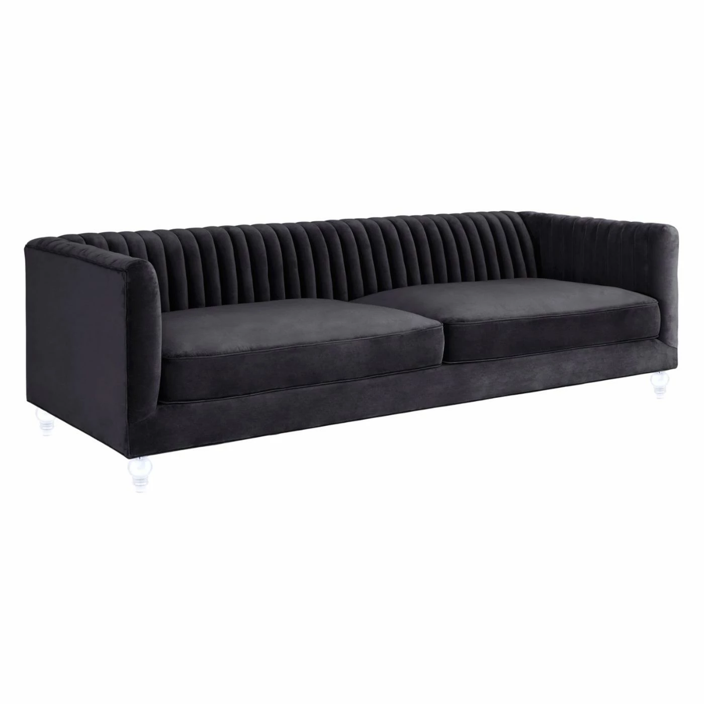 With the TOV Furniture Aviator Velvet Sofa in your living space, your interior is cleared for takeoff and ready to reach new heights of sophisticated transitional style. A new twist on the classic tuxedo-style sofa, the piece features pleats along its back and continuous high arms. Smooth seat cushions bring textural contrast and are filled with supportive high-density foam. The sofa seems to hover weightless above the floor on legs crafted out of clear acrylic. Offered in your choice of available velvet upholstery colors, the contemporary seating solution is completely handcrafted.