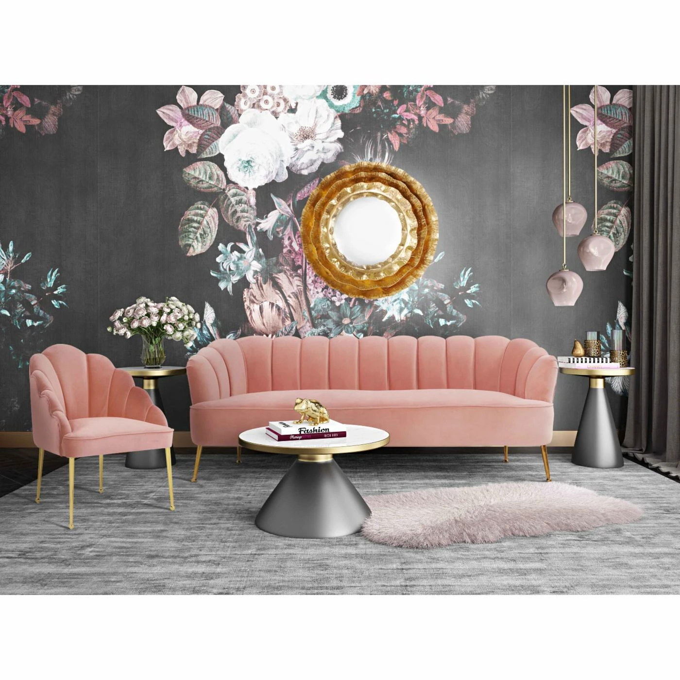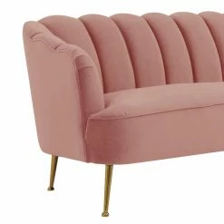 All eyes are on the TOV Furniture Daisy Petite Velvet Sofa in your modern-glam living room, especially when you add gold-sequined pillows or a faux fur throw. The scalloped and channel-tufted back of this sofa creates a flower-like shape that is perfectly paired with floral wall art or accent rugs. The durable wood frame is covered in plush velvet upholstery in your choice of available color.