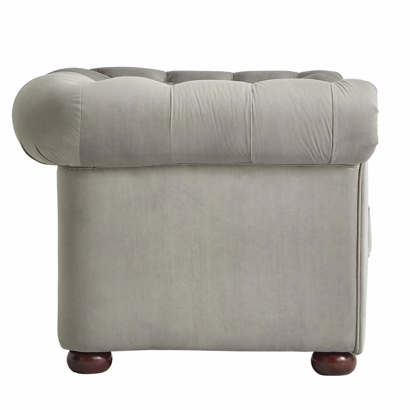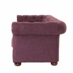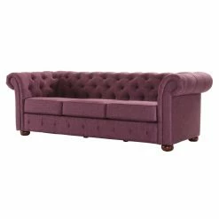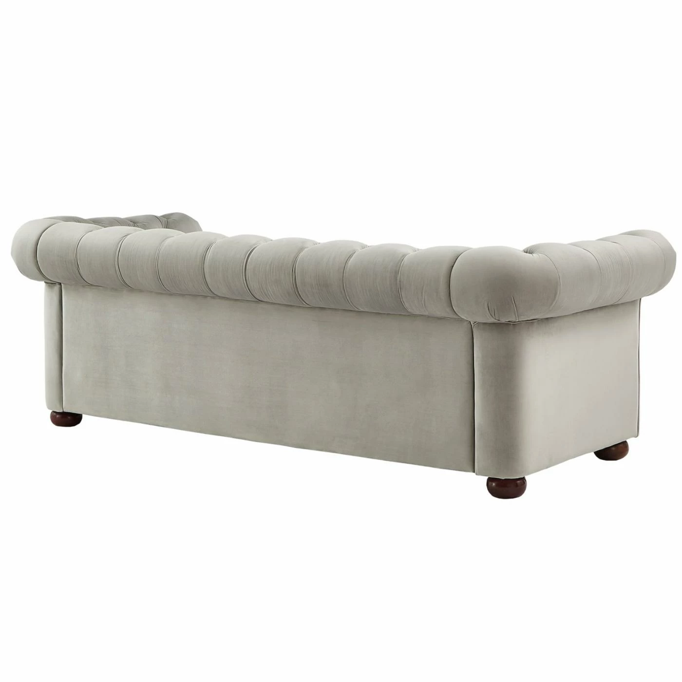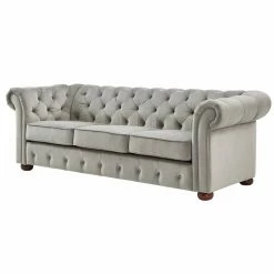 The Weston Home Bowman Velvet Sofa is sumptuously dressed in upholstery and offered in your choice of available colors. For a timeless chesterfield silhouette, this sofa has generously rolled arms and a matching back, both rich with button tufting. It’ s comfortably cushioned, offers room to seat three, and sits on wood bun feet.