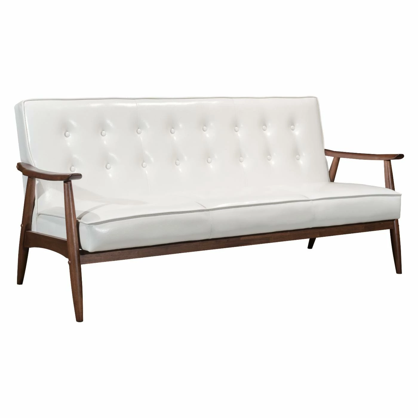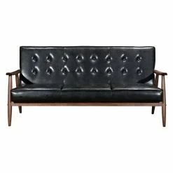 The Zuo Modern Contemporary Rocky Sofa is plush perfection with its thick foam padding. Faux leather upholstery adorns this sofa. It’s button tufted and offered in your choice of available colors. The durable rubberwood frame features sculptural detailing in the arms and legs.
