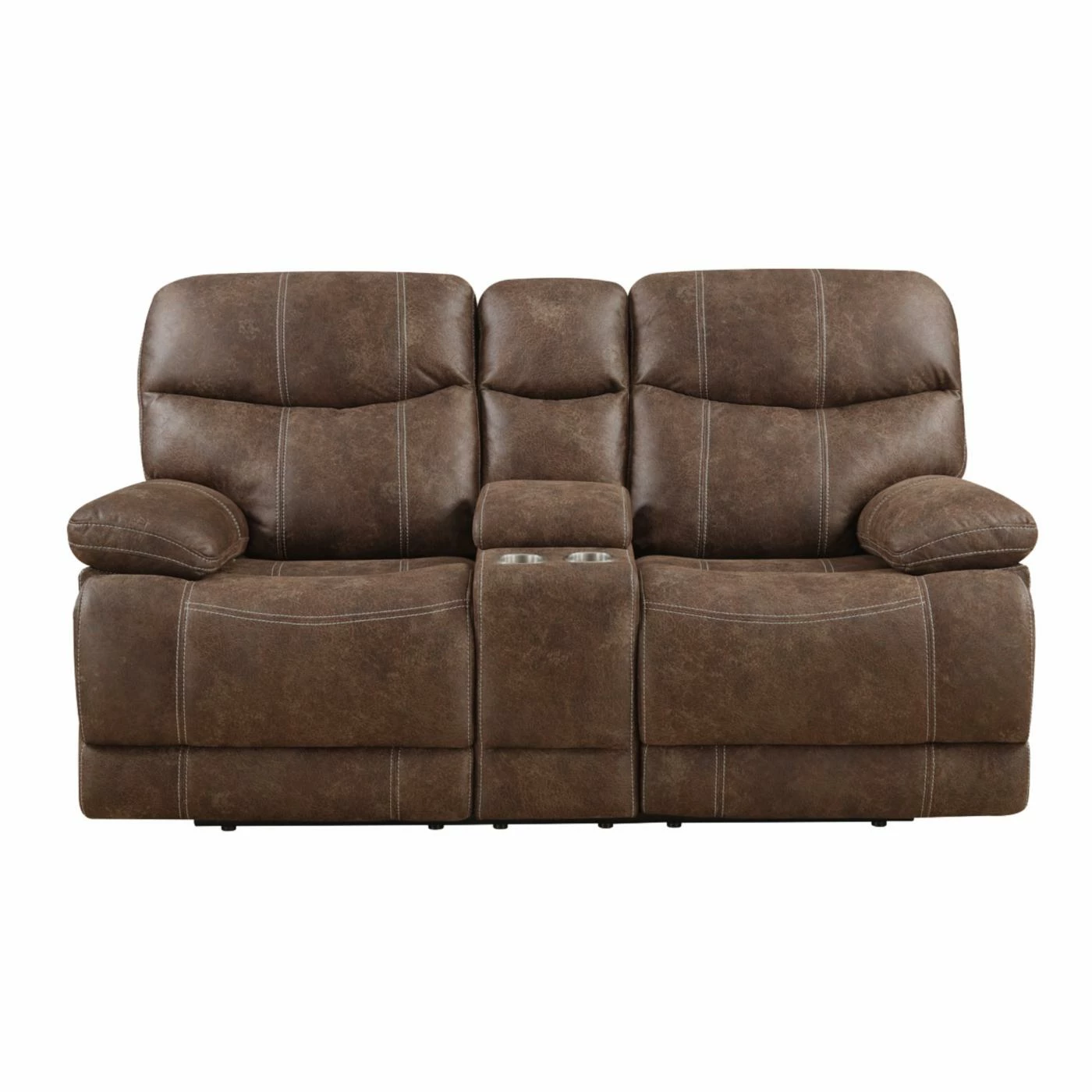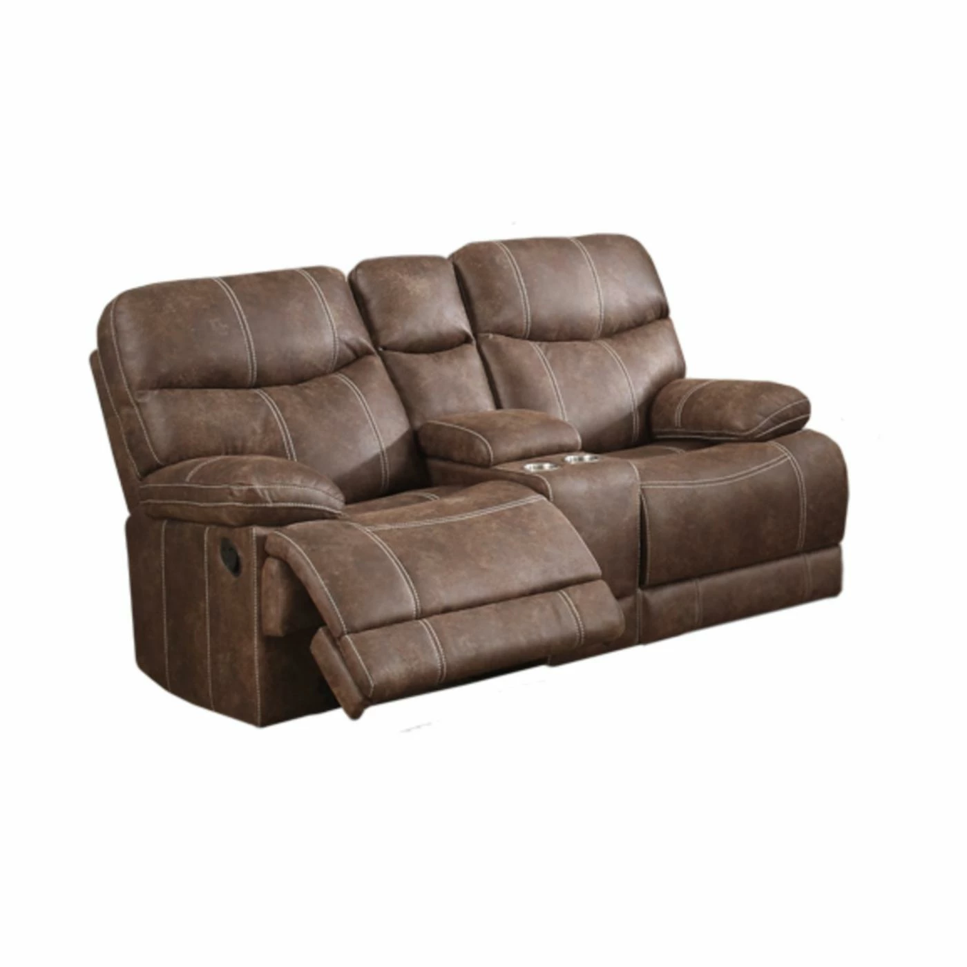 Sink into the relaxing comfort of the Wallace & Bay Franklin Faux Leather Reclining Loveseat. The hickory faux leather fabric and contrast baseball stitching gives a classic look to the soft seat. It has a manual reclining mechanism and middle cupholders for added function for your living or family room.